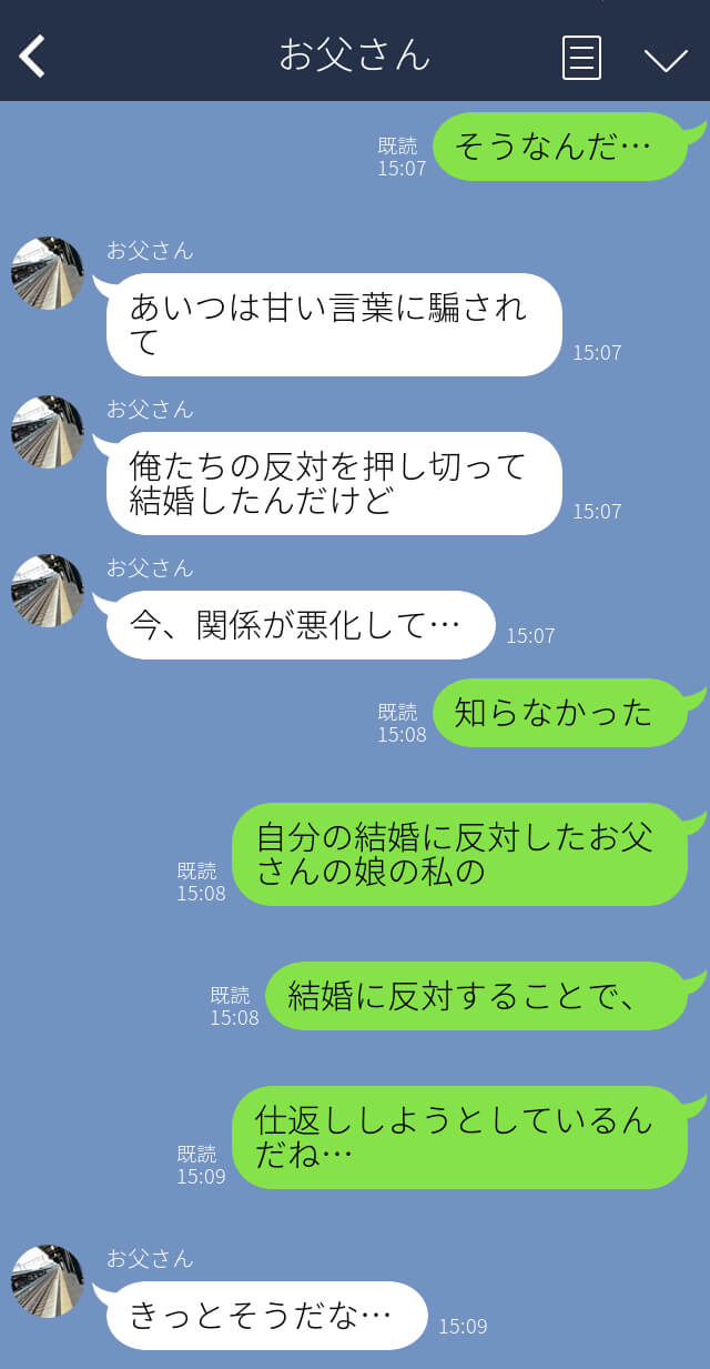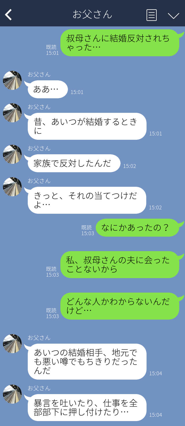 オリジナルコンテンツ 2023年5月7日 『あんな奴やめといたほうがいい!』証拠もないのに結婚相手を反対する叔母→その理由は過去の出来事の仕返しをするためだった…! 父に話すと… 叔母の結婚は失敗 次のページ 叔母の現状 1 2 3