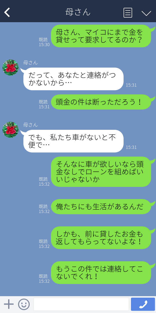 オリジナルコンテンツ 2023年5月12日 『30万円貸して』しつこくお金をせびる義母…夫へ相談すると⇒ブチギレ夫がお説教開始!? どういうつもりだ! 「新しい車を購入したいからお金を貸して」と頼んできた義母。 嫁にも無心をするようになり、見かねた夫がきっぱりと断ったのでした…。 たしかに車がないと不便かもしれませんが、夫婦の事情も考えてほしいものですね。 次の話>> 1 2 3