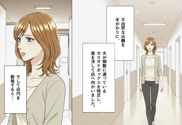 不自然な出費を手がかりに、夫が頻繁に通っているカラオケボックスを特定し、意を決して店へ向かいました。