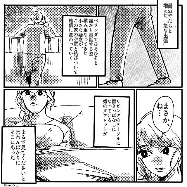 今回の体験談は、妻が自分の不在時に我が家で起こっていた“まさか”の出来事と、その前兆となる出来事という「点と点」がつながり、夫に詰め寄るというお話です。
