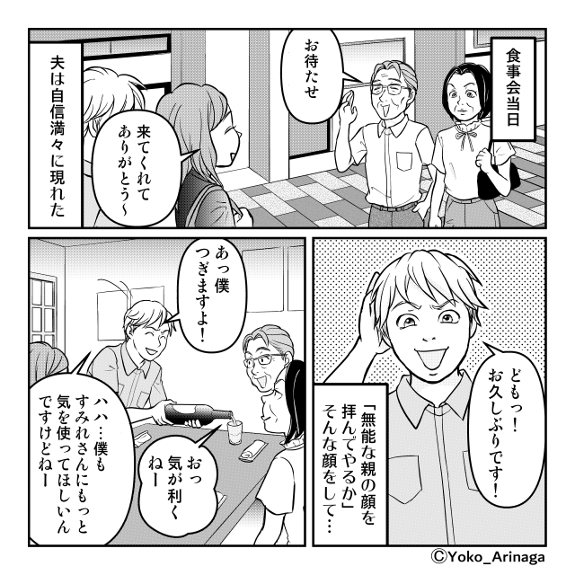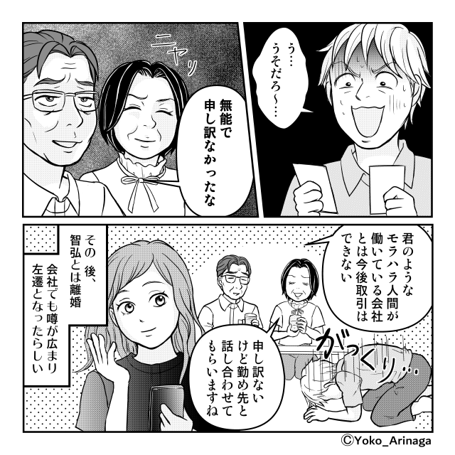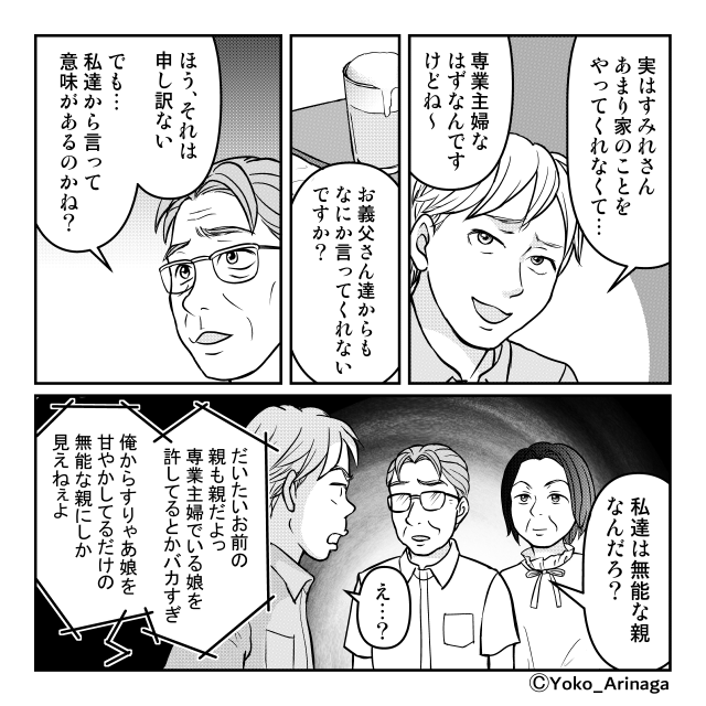 家庭内で王様のように振る舞っていた夫が、自分の社会的地位が脅かされた途端に小さくなる姿は、なんとも滑稽です。