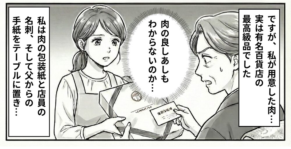 そして私は「肉の良しあしもわからないのか…」と思いながらも冷静に、肉の包装紙と店員の名刺、そして父からの手紙をテーブルに置きました。