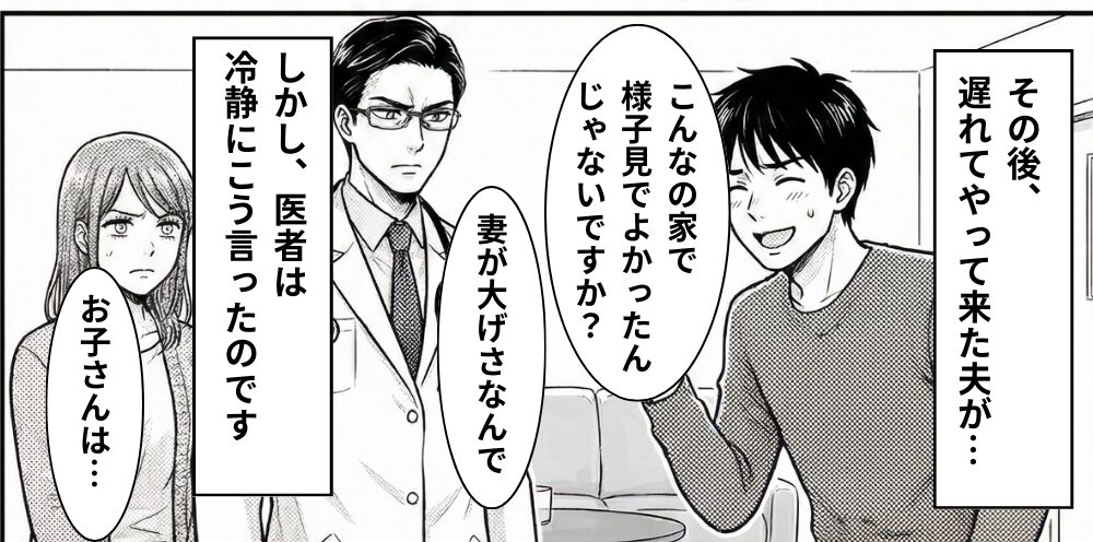 するとその後、遅れてやって来た夫が、医師に「こんなの家で様子見でよかったんじゃないですか?妻が大げさなんで」と、耳を疑うようなセリフを笑いながら言ったのです。