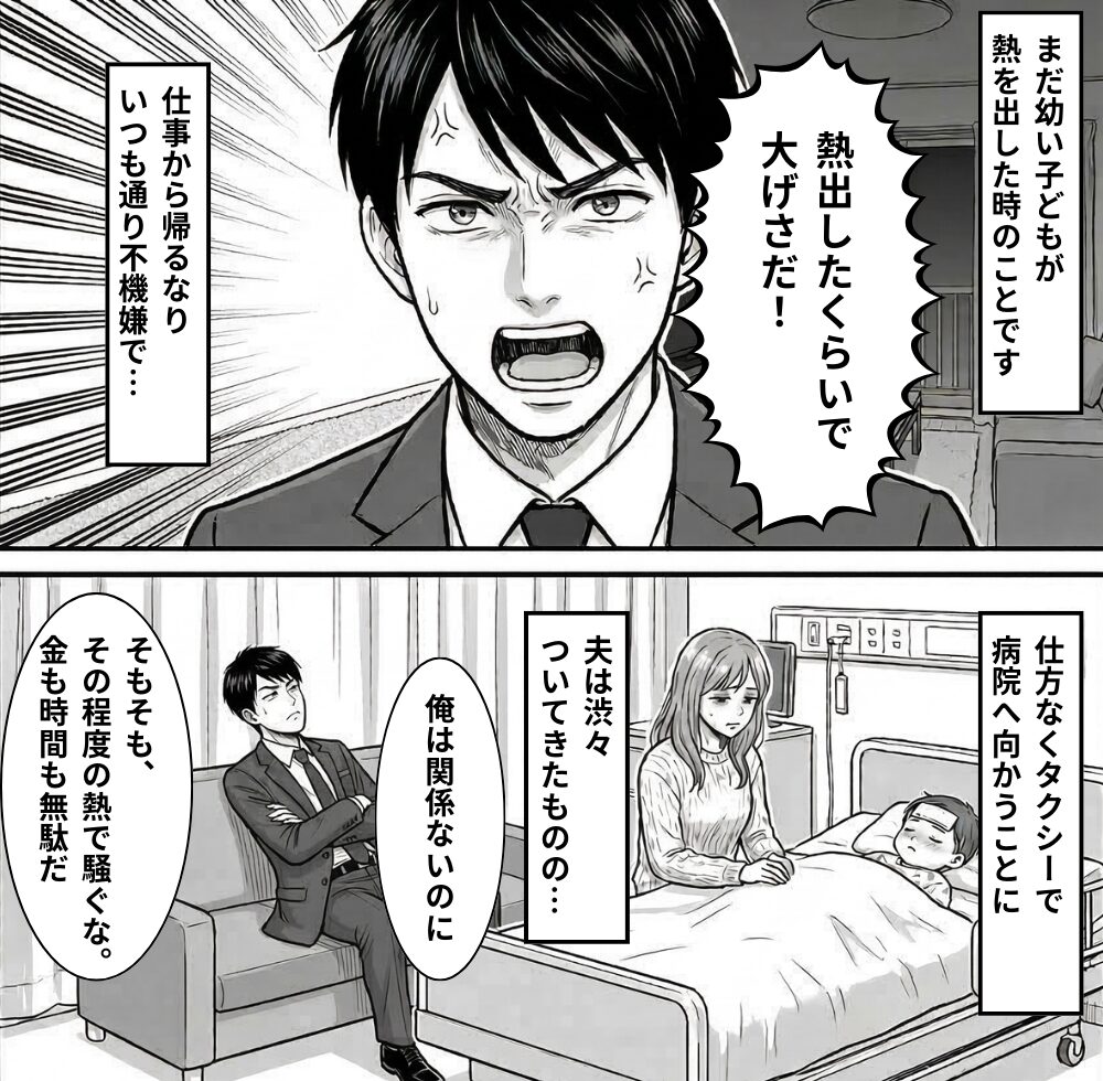 夫は渋々ついてきたものの、医師が状況を説明しているときも、腕を組んで面倒そうな顔で「俺は必要ない。その程度の熱で騒ぐな。金も時間も無駄だ」と言い出す始末。