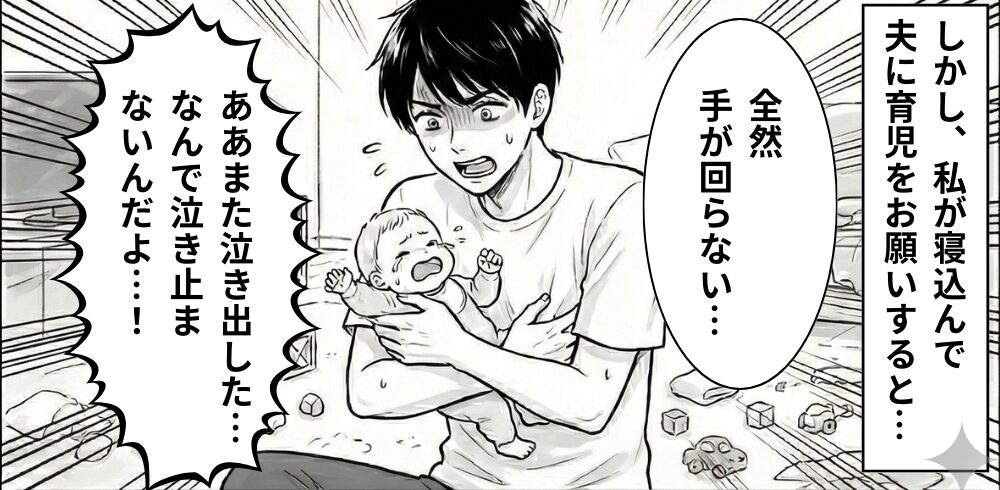 しかし、夫は家事や育児がままならないと「毎日家にいて専業主婦やってるんだからちゃんとしろよ!」と、呆れた表情で言い放つのです。