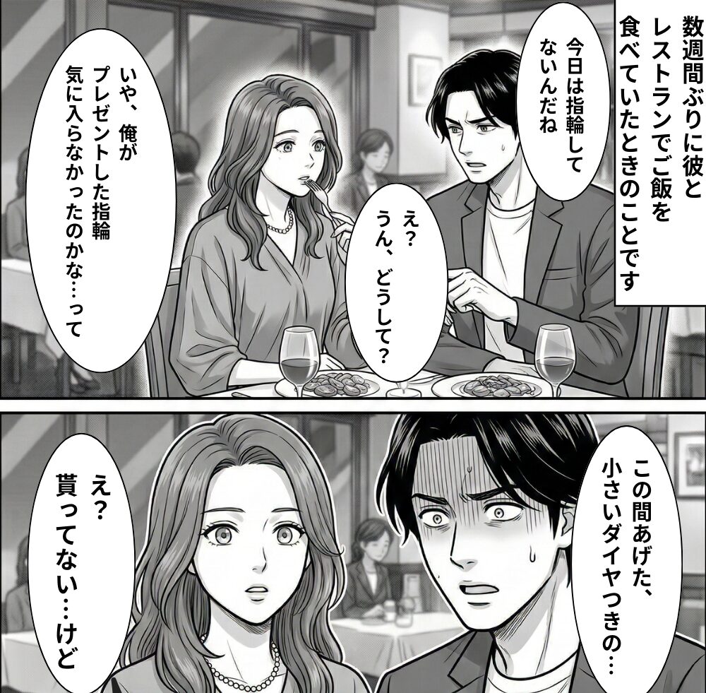 「うん、でもどうして?」と聞いてみたところ「いや、俺がプレゼントした指輪気に入らなかったのかな…って」と言う彼。