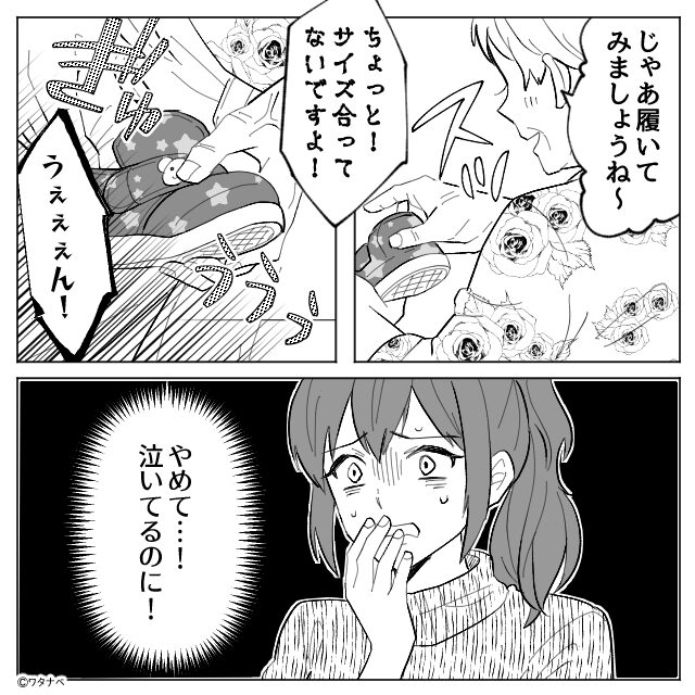 泣き叫ぶ息子の足を無理やり押し込む義母
