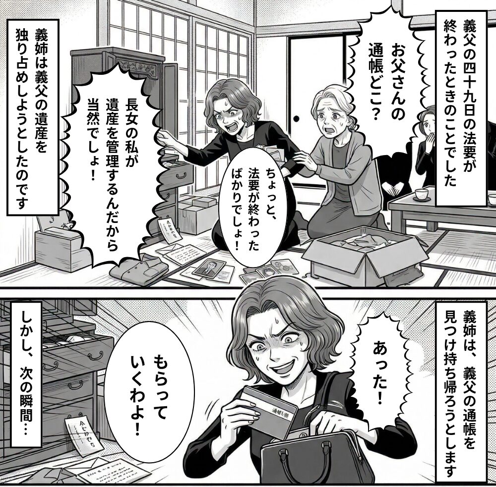 その後、義姉は義父の部屋から通帳を見つけると、勝手に封筒へ入れてバッグにしまおうとしました。