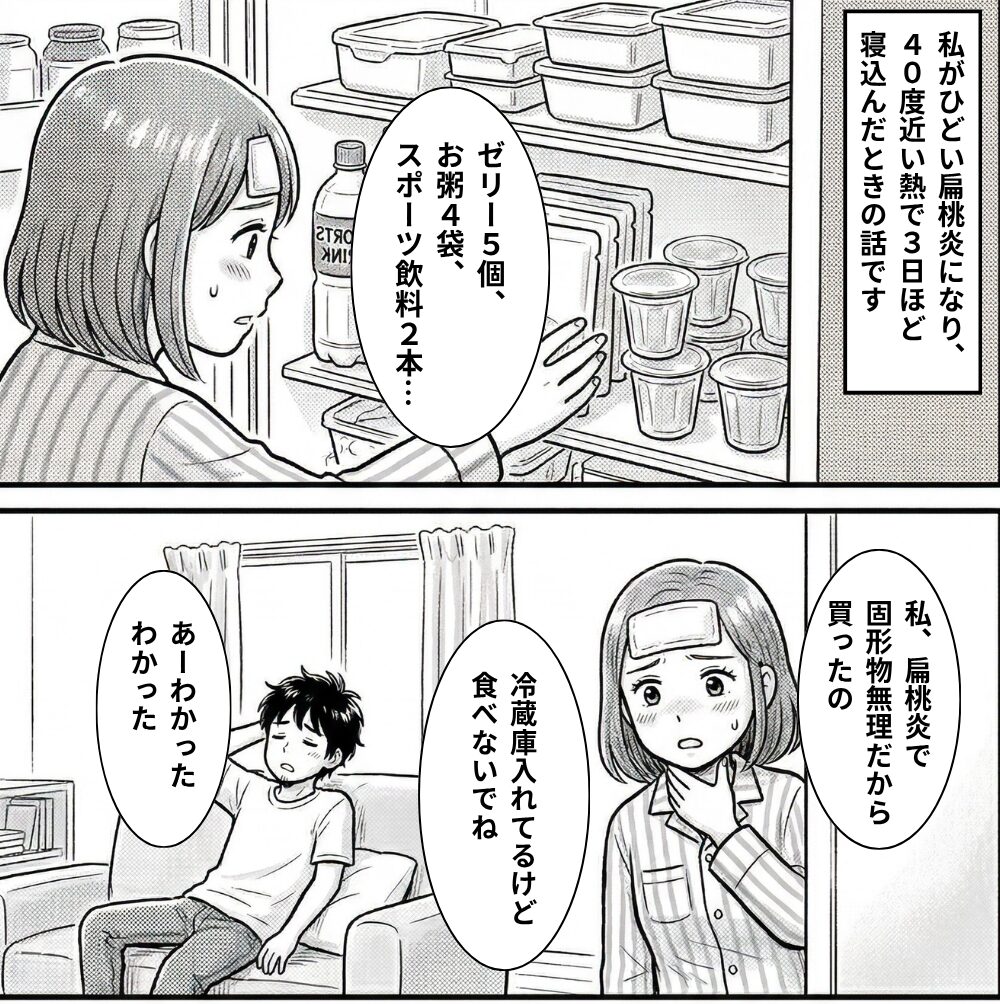 事前にゼリー5個、レトルトお粥4袋、プリン2個、スポーツ飲料2本を買っておき、夫には「私が治るまでの分だから使わないで」と伝え、袋を分けて冷蔵庫の一角に置いておきました。