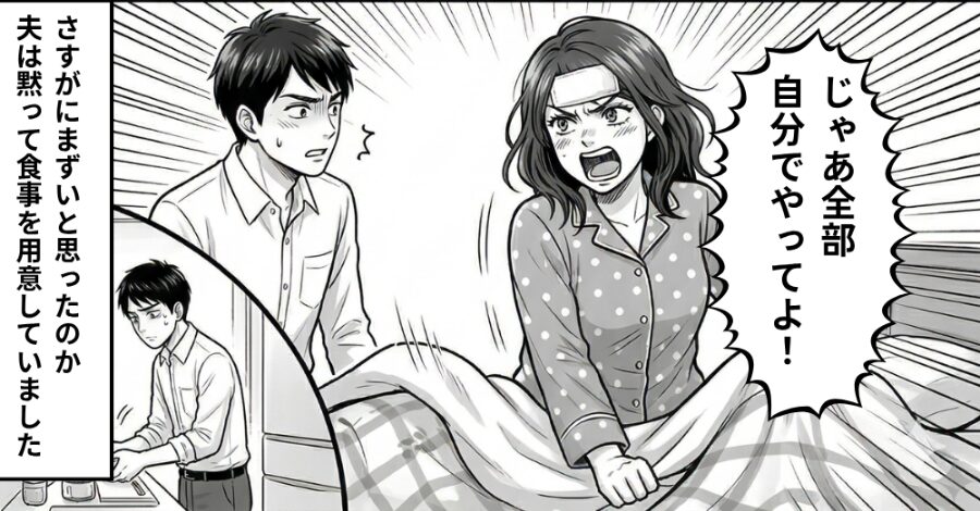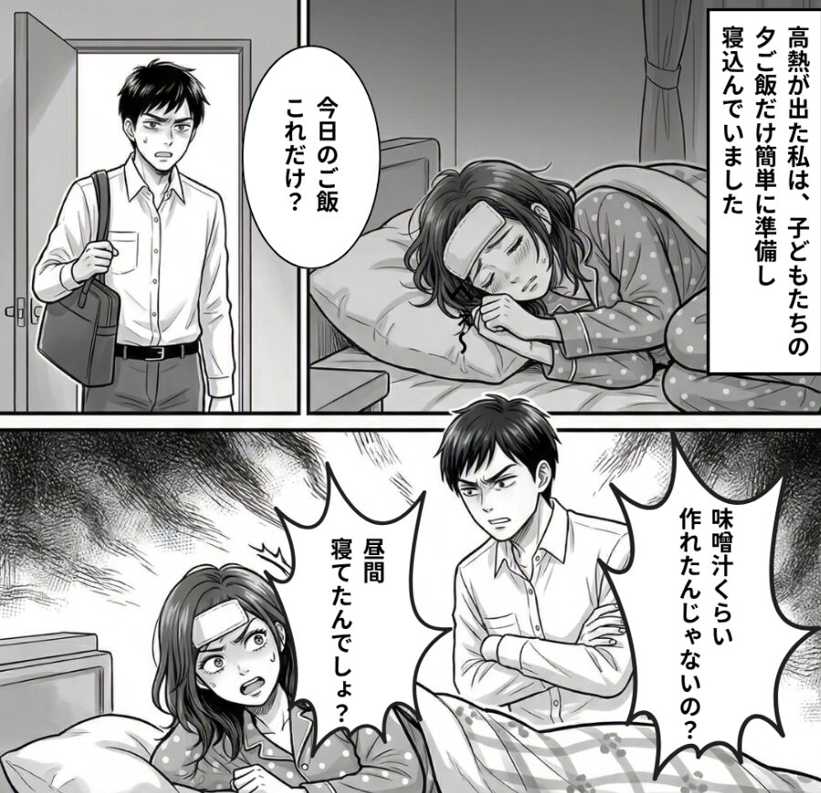 私は熱があることを伝え「簡単なものしか用意できなかった」と説明しましたが、夫は気にする様子もなく「俺だって仕事で疲れてるのに」と言い出す始末。