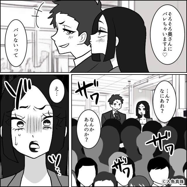 出社してきた夫と浮気相手は、自分たちの浮気現場を目に焼きつける同僚たちの視線に晒され、一瞬で顔を真っ青にして「嘘…だろ…」と立ち尽くしていました。