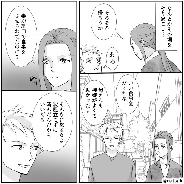 義実家で”嫁だけ”…紙皿を使わせる義母。義母の肩を持つ夫に⇒嫁「あなたも使い捨てに…」夫を青ざめさせた【結果】