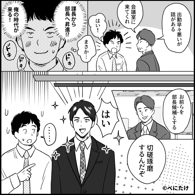 連載マンガ 2026年4月6日 昇格を狙う俺が社内政治に手を出した結果#1話 部長候補とする あいつに負けたくない 次の話>> 作画:べにたけ 原案:Grapps編集部 編集:Grapps編集部 1 2