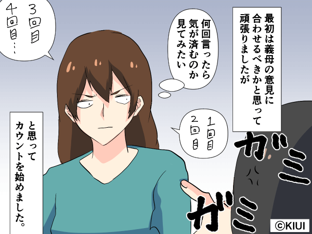オリジナルマンガ 2023年4月21日 「何回言えばいいんだろうね!」家にくるたび義母に難癖をつけられる…→数え始めると”とんでもない回数”になっていた!? 数えてみることに… 100回を超えていた! 100回以上も難癖をつけている義母。 言う方もすごいですが、毎回言われる嫌味に耐えているお嫁さんに拍手です! ※こちらは実際に募集したエピソードをもとに記事化しています。 次の話>> 1 2