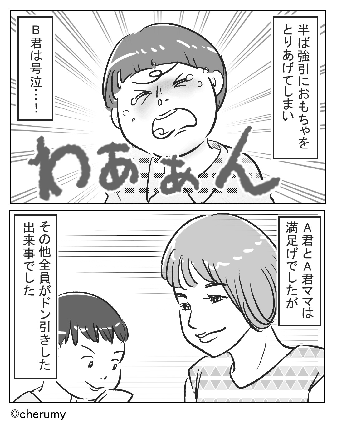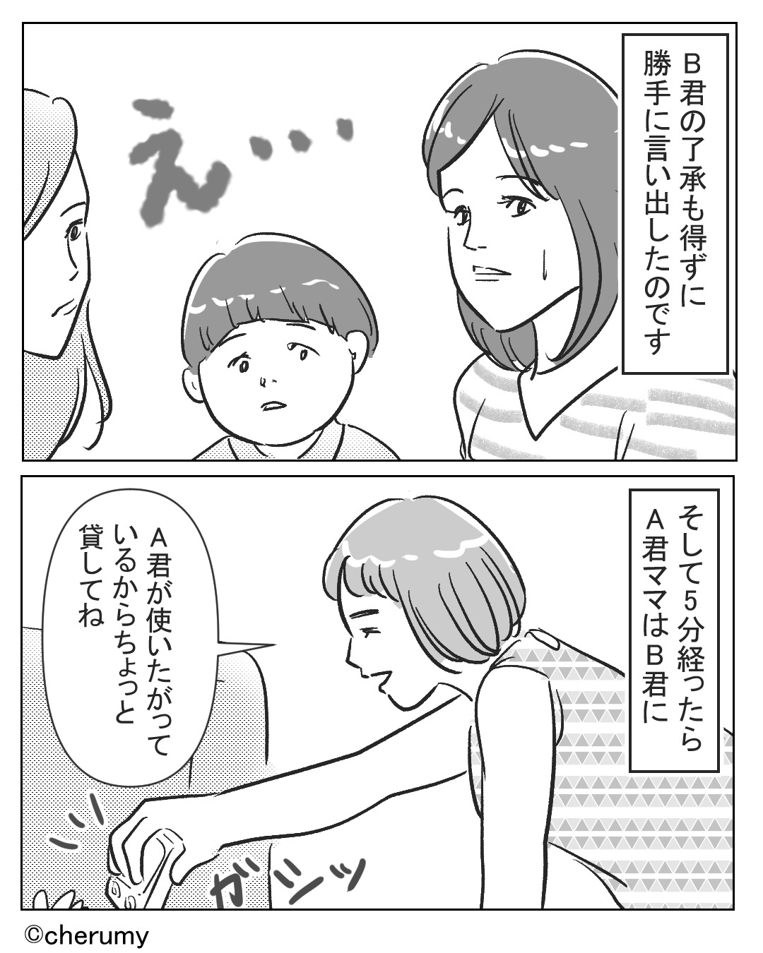 オリジナルマンガ 2023年8月13日 『うちの子が使いたがってるから!』他人のおもちゃを奪い取るママ友…!?持ち主の【反応】を顧みない姿にドン引き…! 勝手に言い出した 全員がドン引き 他の子のおもちゃを強引に取り上げて、自分の子どもにあげるなんて…。 このような行動をするママ友とは、今後の関わり方を考えたいですね。 ※こちらは実際に募集したエピソードをもとに記事化しています。 次の話>> 1 2