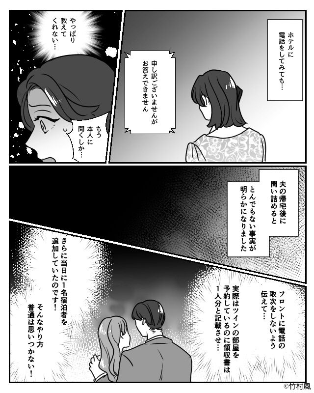 オリジナルマンガ 2025年10月8日 『また出張?多いね…』突然出張が増えた夫に違和感。しかし“ホテルの領収書”は1人分…?⇒後日、偶然発覚した【巧妙な手口】に唖然…! ホテルに電話をすると… 元ホテルマンの知恵 元ホテルマンの知恵を利用して、浮気の裏工作をしていた夫。 浮気のために試行錯誤していたと思うと腹が立ちますね。 浮気をするような不誠実な男性とは、関係を見直してみることが必要かもしれません。 ※こちらは実際に募集したエピソードをもとに記事化しています。 次の話>> (Grapps編集部) 1 2