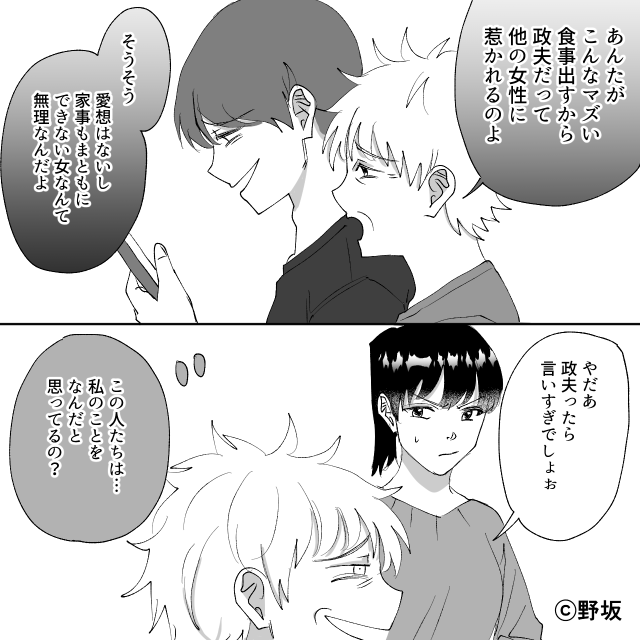 「政夫言い過ぎでしょお」と、義母は自分の息子を甘やかしながら嫁をいびる