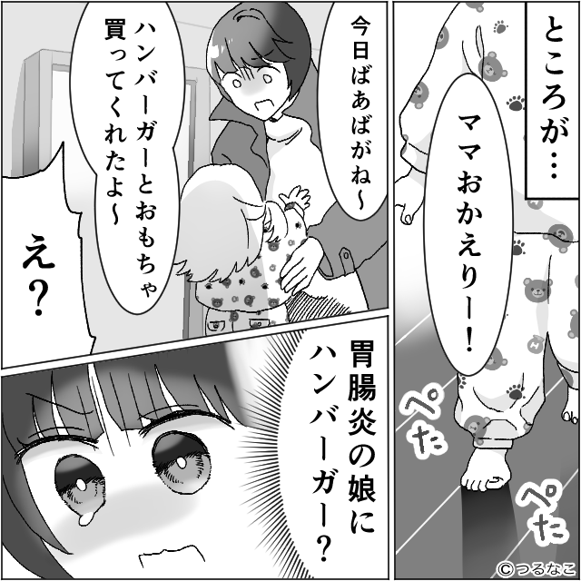テスト 2024年1月17日 胃腸炎の娘を義母に預けた嫁「お昼はうどんを食べさせてください」しかし帰宅後「今日ばあばがね…!」娘の発言に崩れ落ちる ハンバーガーを食べていた 出典:Grapps 正解は… 正解は「ハンバーガー」でした。 「今日ばあばがね~ハンバーガーとおもちゃ買ってくれたよ~」という娘の言葉を聞き…。 胃腸炎の娘にハンバーガー?と驚愕した主人公。 またしても義母への信頼を失ったのでした。 ※本文中の画像は投稿主様より掲載許諾をいただいています。 ※作者名含む記事内の情報は、記事作成時点でのものになります。 次の話>> (Grapps編集部) 1 2