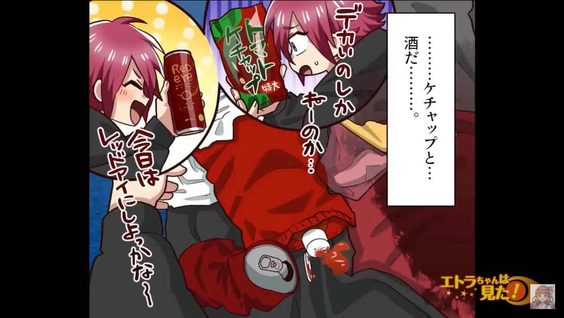 血だと思っていたものは主人公がコンビニで買ってきたケチャップや赤い色の酒やゼリーで、主人公は命に別条はなかったのでした。